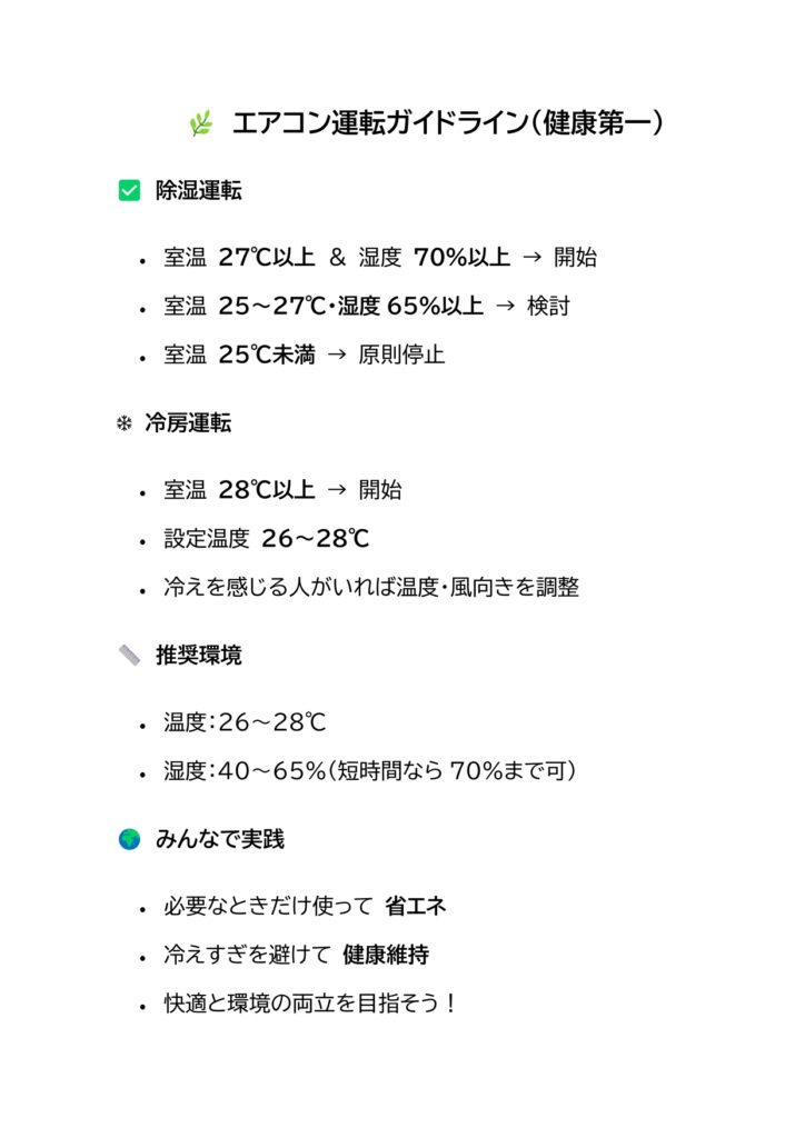 こうした背景から、当社ではエアコン運転ガイドラインを改訂しました。
